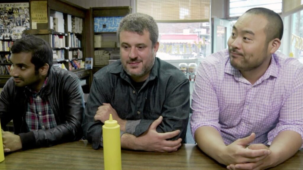 This episode explores Chang’s relationship to the pig. He travels to San Sebastian to discuss pork bushi. He makes pork belly, and tonkotsu and travels to Montreal with his pal Aziz Ansari for a fried bologna sandwich. In the kitchen, David makes a “red-eye mayo;” his pastry chef shows how to make a salty sugary late night snack–the corn cookie ham and cheese.